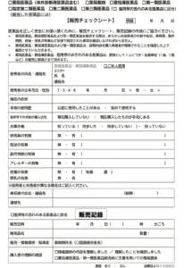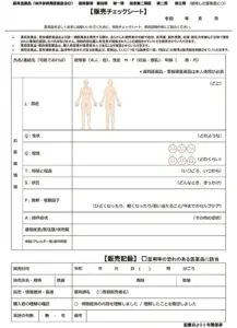 ②は当委員会の一員が所属している薬局で使用している記録簿で、【販売チェックシート】の裏面に【接客ノート】を印刷して使用しています。一般用医薬品の販売時に確認すべき項目を網羅しており、問診した内容を「接客ノート」にてSOAP形式で記録可能です。今回、「濫用等の恐れのある医薬品」の欄を追加致しました。