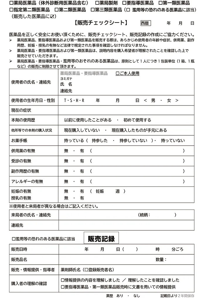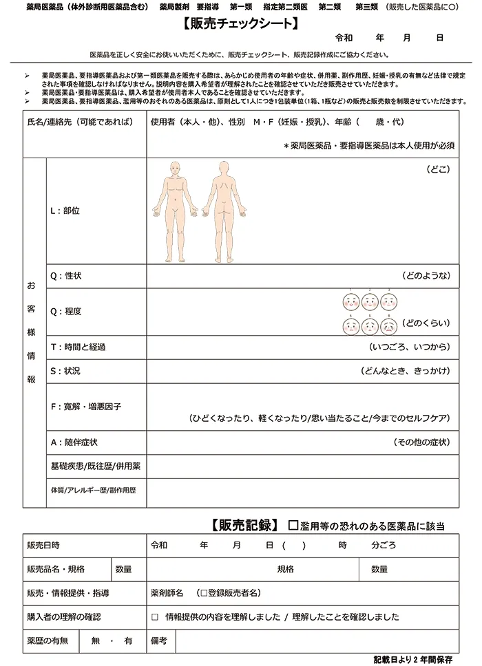 ③は以前公開していた販売記録をベースに、「濫用等の恐れのある医薬品」の欄を追加しています。頻回購入者に対しての抑止とスタッフ間の情報共有のツールとしての活用を想定しています。