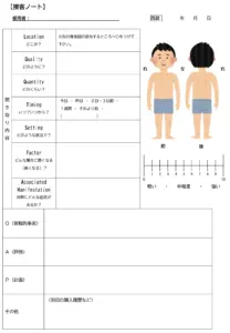 濫用防止チェック欄の追加、インタビュー項目の簡略化、人体図およびフェイススケールを追加しました。インタビュー項目簡略化は、記入者の裁量により情報の一元化にムラが出る可能性があるという点はいなめませんが、業務負担が大きく変動し、需要者への対応に柔軟性がうまれるのではないかと思います。