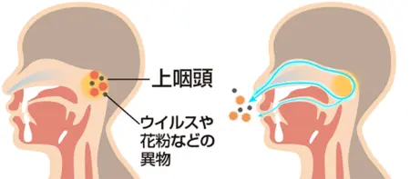 ノドではなく鼻の中を洗い流す方法で、鼻をかんでも出てきにくい粘り気のある鼻水や、アレルギー物質(花粉やハウスダストなど)、雑菌、ウイルスを取りのぞくことによって、風邪、アレルギー性鼻炎、鼻づまり、副鼻腔炎などへの対策効果が期待されます。