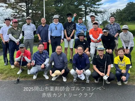 令和4年から毎年秋に開催され、恒例となりましたゴルフコンペです。10月に入ってもまだまだ暑さの残る中ですが、時折涼しい風も吹きゴルフ日和となりました。今回はトマト銀行6時間リレーマラソンと同日の開催となり、リレーマラソンにも薬剤師会会員が数名参加されているためゴルフコンペは例年より少なめの人数でした。それでも5組19名が参加され賑やかなコンペとなりました。普段は顔を合わすことが少ない会員や岡山支部外、病院薬剤師会からも参加をいただき、ゴルフを通じて良い交流となりました。