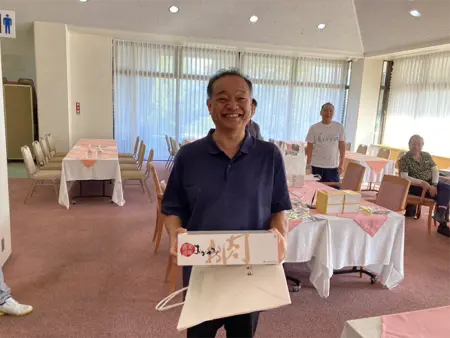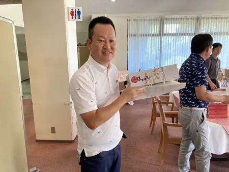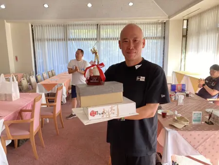 最近のゴルフ場はどこも乗用カートがあり、カートのナビで他の組の途中経過のスコアや順位が見れるので、大いに盛り上がりました。18ホールが終わった後はクラブハウスにて表彰式を行いました。成績は上記の通りです。第3位までが岡山支部以外の支部の先生が独占されました。岡山支部の皆さん頑張りましょう!優勝賞品はなんと岡山県産和牛。入賞者だけでなく参加者全員に賞品が用意されていました。賞品はすべて肉、スウィーツなどの食品だったため、参加された皆様は賞品を持ち帰り家族にも喜ばれたことかと思います。さらにニアピン、ドラコンなどの景品もあり一人で3~4個の景品を持って帰る先生もおられました。ワイワイと賑やかで楽しく充実したゴルフコンペでした。