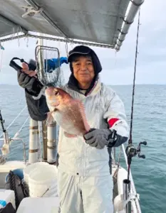 その後も吉田先生は釣れ続け計6枚の鯛を釣りあげました。他のメンバーはポロポロと恥ずかしいサイズを釣る感じでした。新留先生も最後まで竿を置くことなく粘り強く頑張っておられました。加藤先生はとんでもないくらい大きいあたりがありましたが、バレてしまいました。おおきかったんだろうなあ・・・・・。