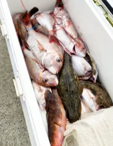 いろいろありましたが、結果はご覧の通りクーラーの底が見えないくらいにはなりました。鯛以外にはコチが何匹か釣れています。この魚も煮つけにすればとてもおいしく頂けます。