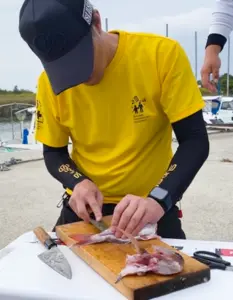 表彰式も終わり港では、吉田先生のリクエストで釣れた魚を三枚おろしにするイベントが開催されました。